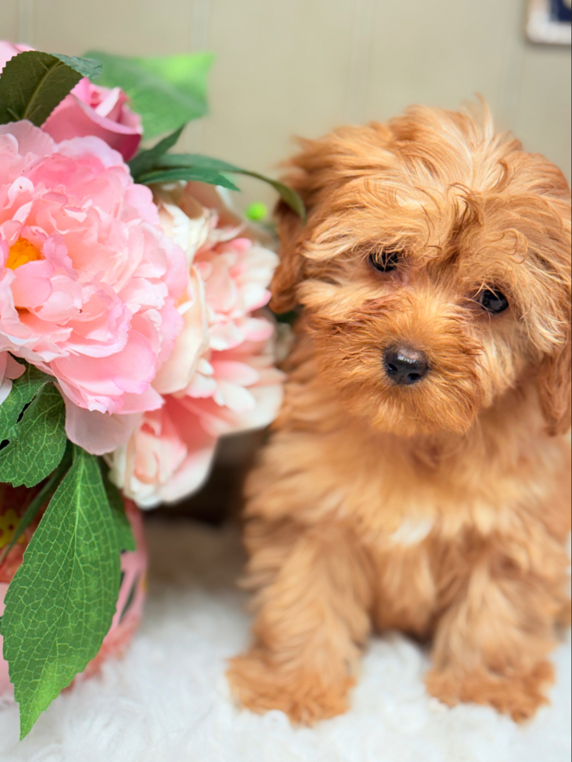 Meet Ariel, a beautiful apricot F1B Cavapoo puppy with a soft fluffy coat and sweet teddy bear face. She is loving, playful, and perfect for families. Ready for her forever home!