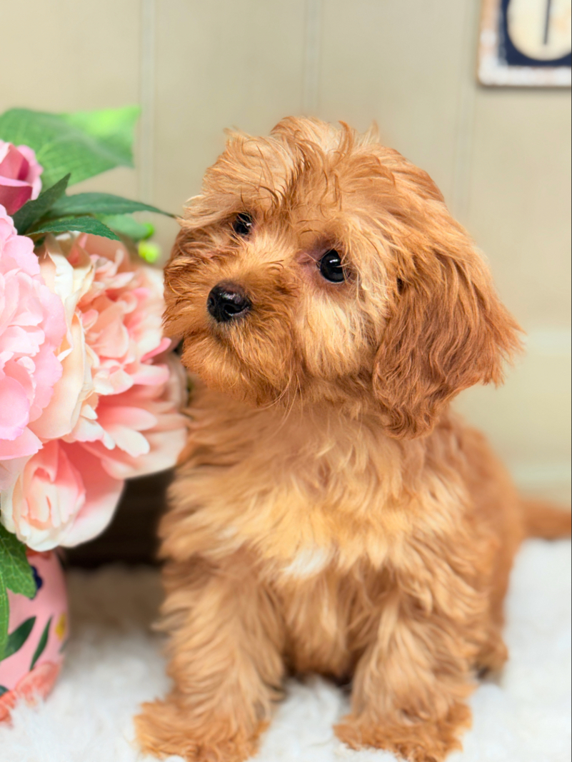 - This adorable ruby Cavapoo puppy features a beautiful honey apricot wavy coat and an irresistible teddy bear face. Cavapoos are known for their affectionate personality, intelligence, and low-shedding coats, making them wonderful companions for families, couples, and retirees. Raised with love and socialization at Puppies on the Gulf, this puppy is ready to bring joy to a lucky home.