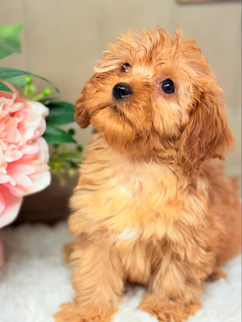 Ariel is an adorable apricot female Cavapoo puppy with a soft, fluffy coat and a precious teddy bear face. She has a gentle, affectionate personality and loves being around people.