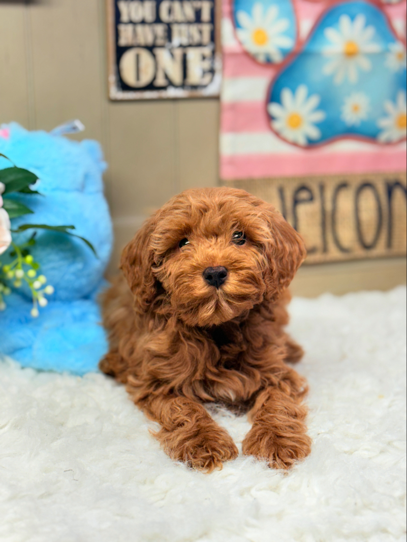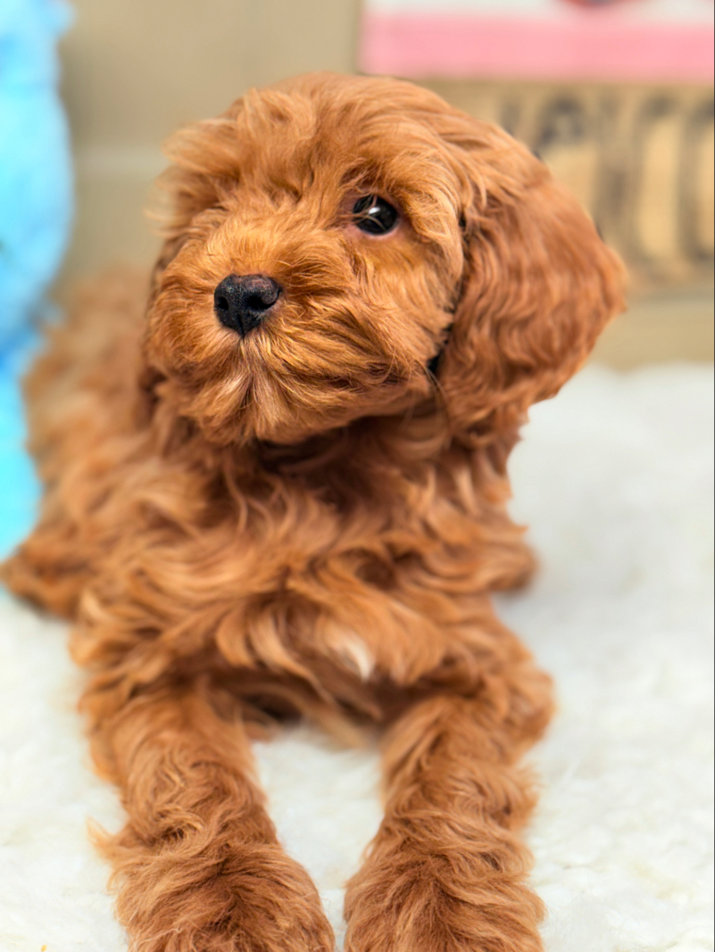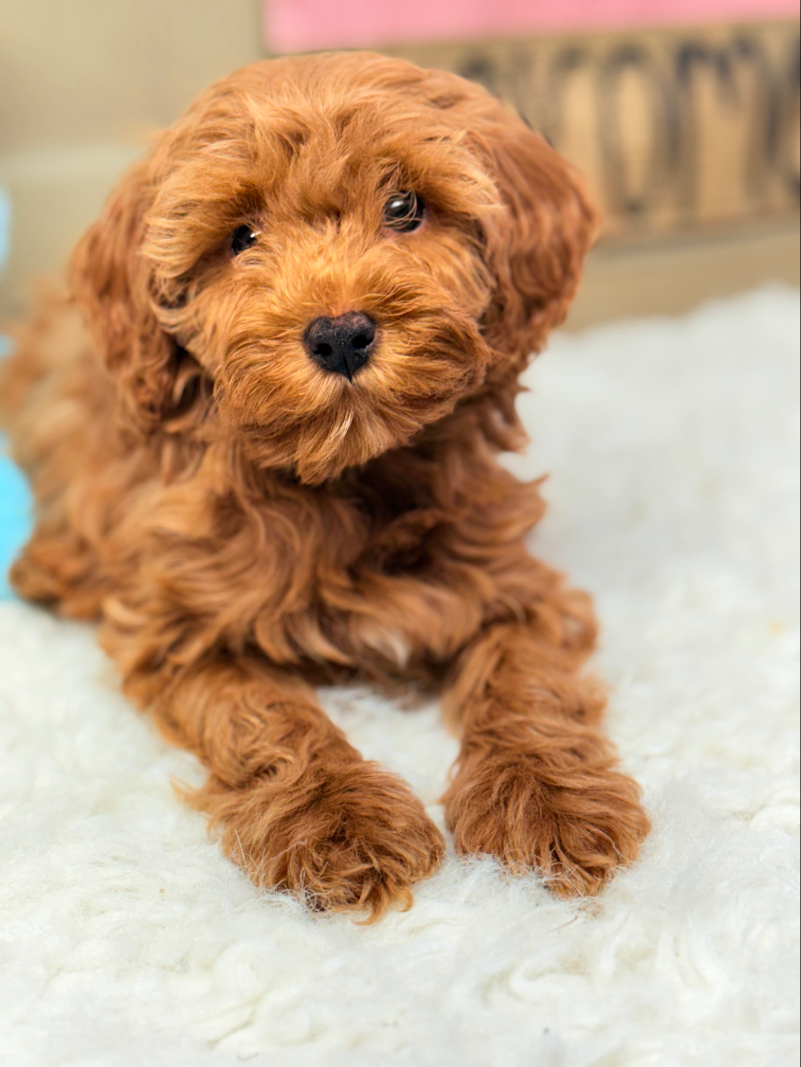 Meet Arlo, a beautiful ruby red F1B Cavapoo puppy with a beautiful and perfect Teddy Bear face and super sweet personality. He is loving, playful, and perfect for families. Ready for her forever home!