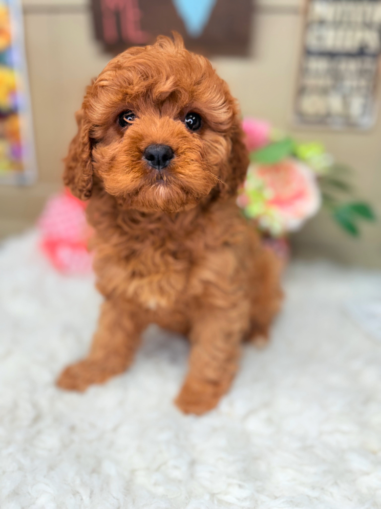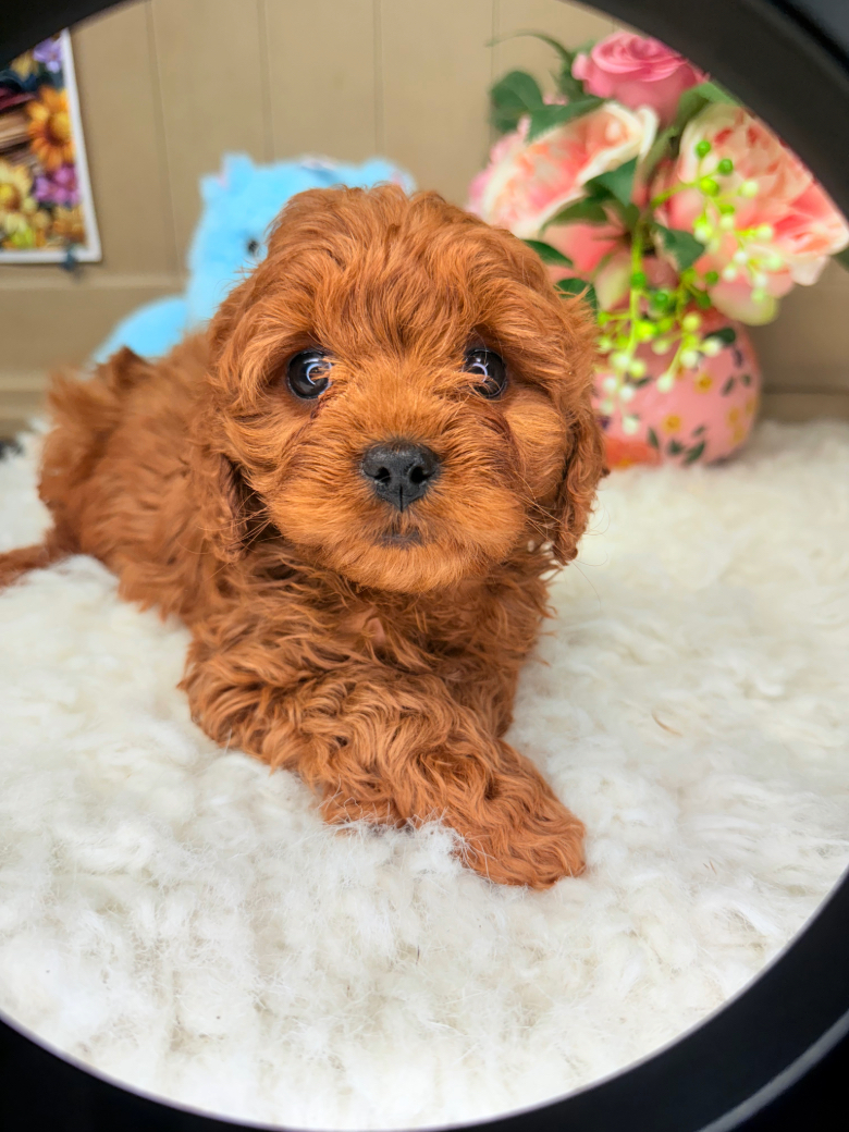 Beautiful red Cavapoo puppy with a soft curly coat and sweet teddy-bear face. Raised with love from AKC parents, this puppy is playful, affectionate, and expected to mature around 10-12 lbs. Perfect companion for families, children, or anyone wanting a loyal little best friend.