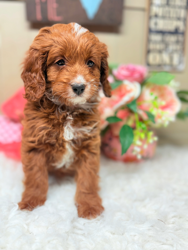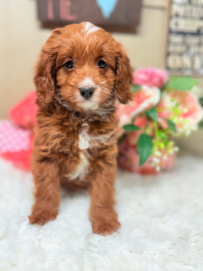 This beautiful red Cavapoo puppy features a rich apricot-red coat with charming white markings on the chest and nose. Cavapoos are a wonderful cross between the Cavalier King Charles Spaniel and Poodle, known for their affectionate personality, intelligence, and low-shedding coats.