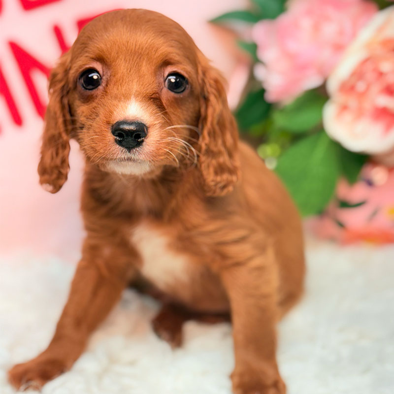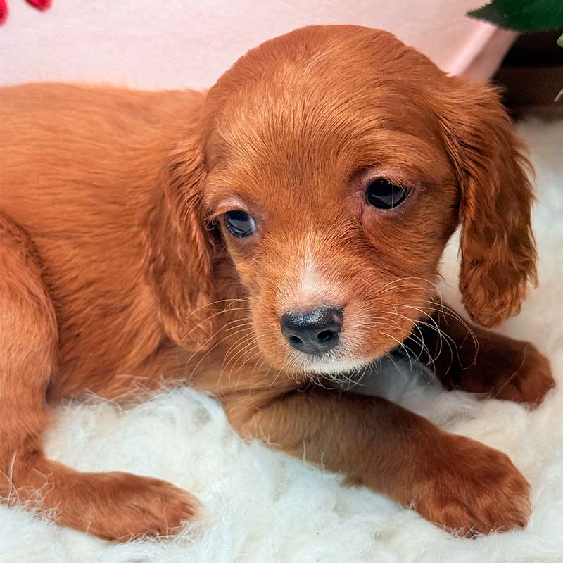Sophie has a stunning vibrant Ruby Red Wavy straight coat that truly favors the Cavalier King Charles Spaniel Side. We call her part of our Scarlett Line! She is so delightfully happy and playful and will surely turn any frown upside down! She is such a PRECIOUS SweetHeart! She definitely would be the perfect addition to any family. Don’t miss the opportunity to bring home this delightful gorgeous adorable CUTIE PIE Cavapoo puppy! I’m well socialized and ready to fit into your family! I would love to fill your home with all of my puppy love! I am microchipped and I am up to date on vaccinations and dewormings and will come with a one year genetic health guarantee! Call or text anytime to make me the newest addition to your family and get ready to spend a lifetime of tail wagging fun!