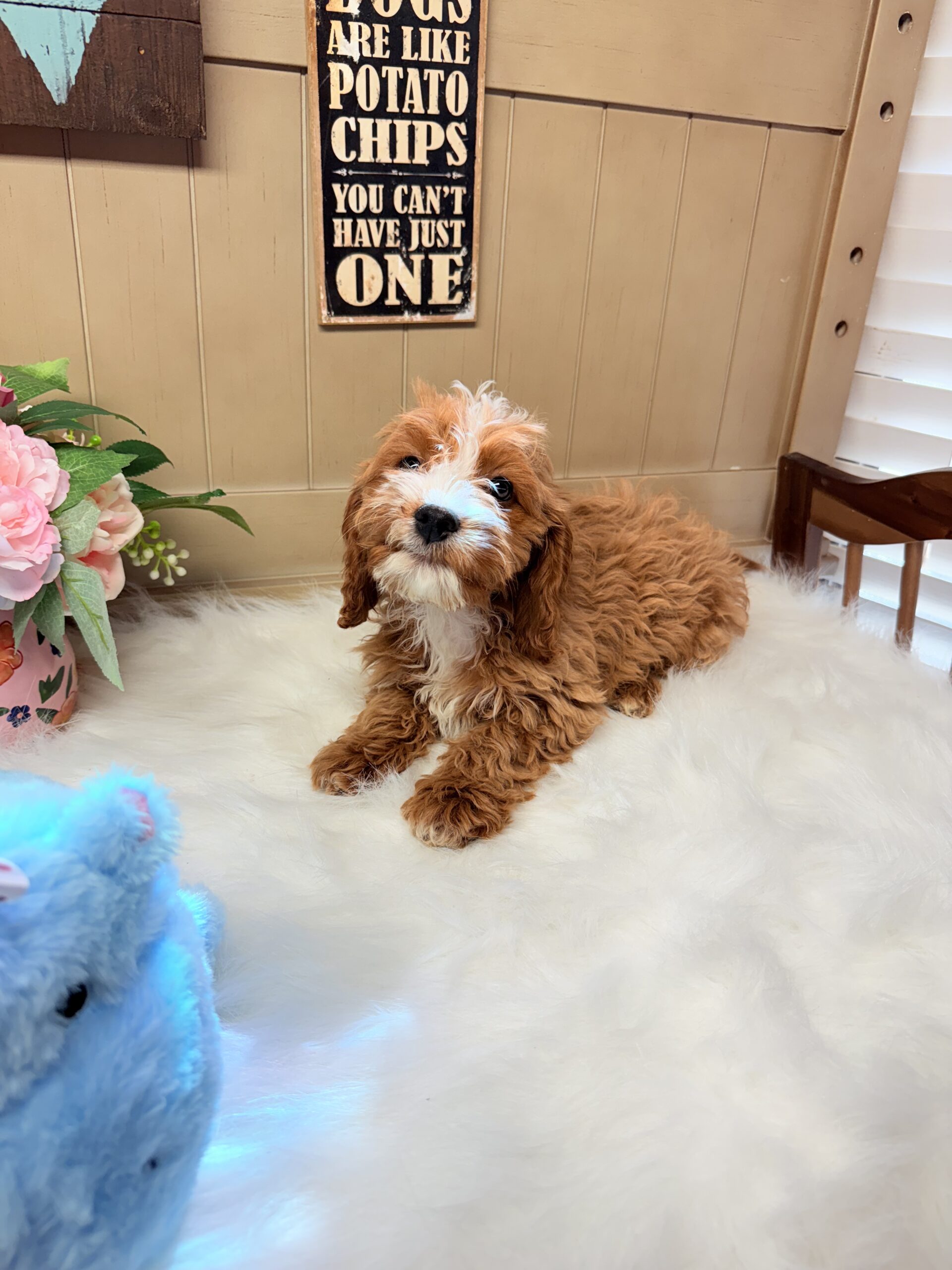 Curly is such an adorable cutie with his beautiful Ruby with White curly  hair and his super sweet personality  Curly should average 14 lbs